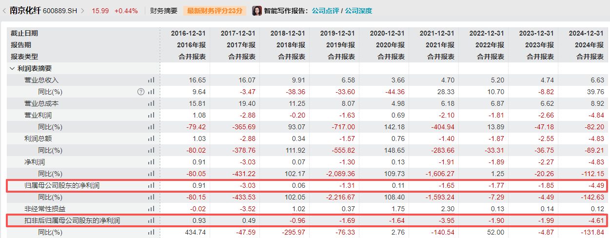 据南京化纤发布的2025年业绩预告,公司2025年预计实现归母净利润-1.1亿元~-7400万元,预计实现扣非净利润-2亿元~-1.58亿元。公司预计2025年实现营收2.7亿元~3.3亿元,扣除与主营业务无关的业务收入和不具备商业实质的收入后的营收为2.4亿元~2.9亿元,低于3亿元。
