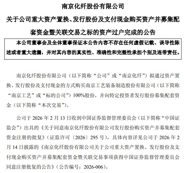今年2月13日,南京化纤的重组方案正式获得证监会批复。值得一提的是,这是2026年沪深北交易所首单经并购重组委审核通过的项目。